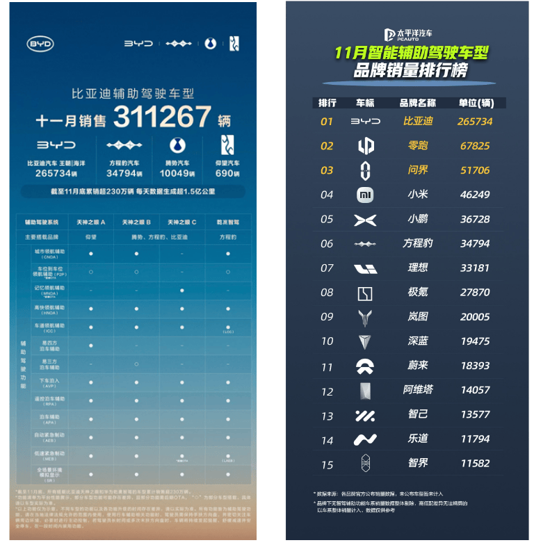 比亚迪近日公布了其搭载“天神之眼”辅助驾驶系统的车型销售成绩,再次以亮眼数据领跑市场。数据显示,11月全月销量突破31万辆,达到311267辆,延续了其在智能驾驶领域的领先优势。其中,王朝与海洋系列贡献了265734辆,而方程豹、腾势、仰望等高端及个性化品牌也表现出色,共同构建了比亚迪在智能驾驶领域的多元化产品矩阵。