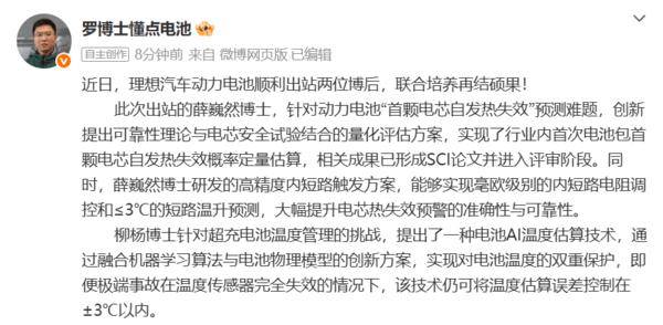 这种"产学研用"一体化培养模式,不仅为青年科研人才提供了将理论转化为实践的优质平台,更通过企业真实场景驱动技术创新,加速了动力电池领域核心技术的突破。随着更多高层次人才的加入,理想汽车在新能源赛道的技术储备将持续增强。