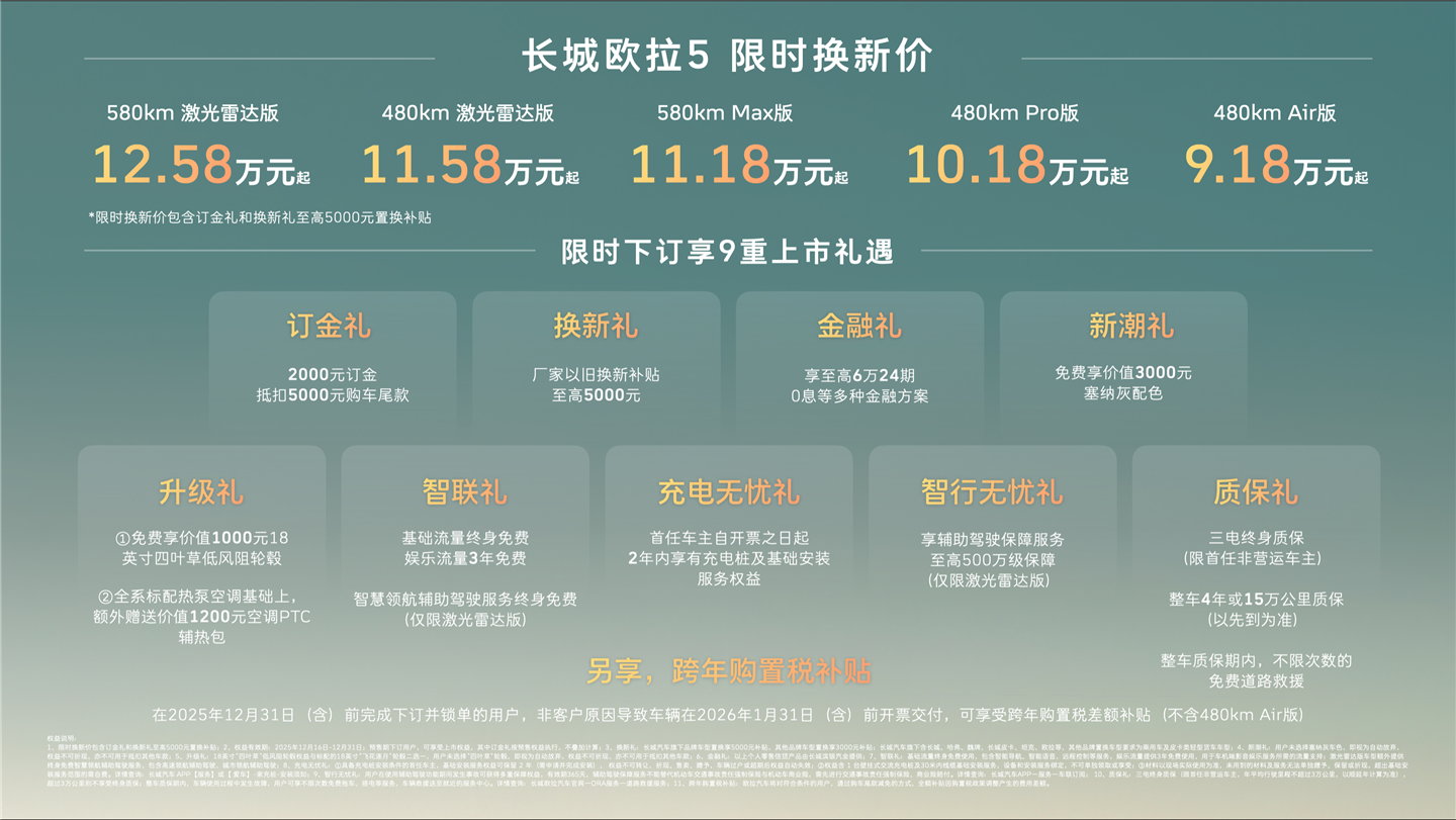 今日,长城汽车旗下欧拉品牌全新A级纯电SUV——长城欧拉5正式登陆市场。新车推出5款不同配置,建议零售价区间为9.98万至13.38万元,限时换新价9.18万元起(包含“订金礼”与“换新礼”至高5000元以旧换新补贴)。即日起至2025年12月31日,用户下订并锁单即可享受包含订金礼、换新礼、智行无忧礼在内的9重上市好礼,以及跨年购置税补贴(不含480km Air版)等购车权益。凭借极具竞争力的价格与越级产品力,长城欧拉5旨在成为全球年轻用户的出行“严选搭子”。