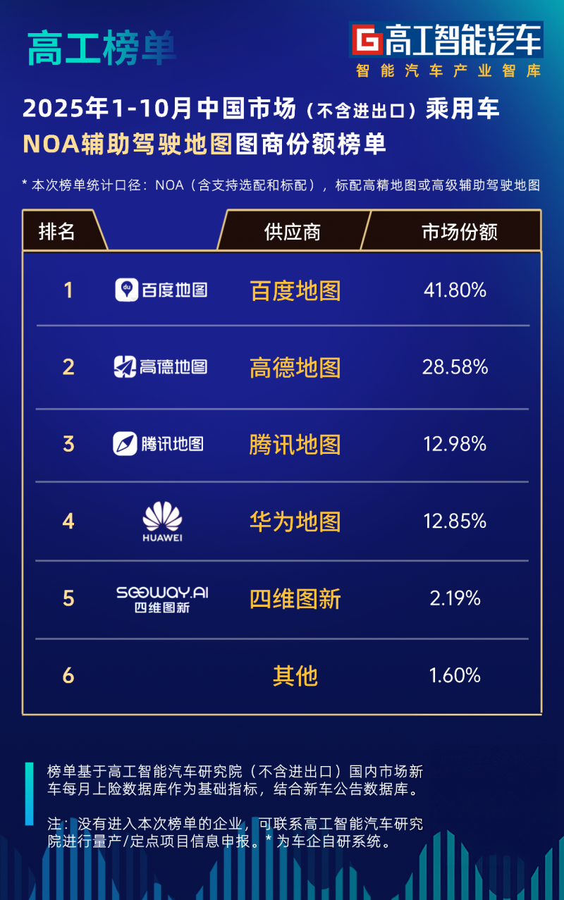 2025年1–10月新售的搭载L2+智能辅助驾驶系统的车型中,已有超过四成选择百度地图,充分体现了其已经成为智能汽车的标配。百度地图在L2+市场的领跑,本质上是导航价值从“路径指引”向“智驾安全基础设施”的升级,其领先地位已形成护城河,随着L3级自动驾驶量产在即,百度地图在车道级导航、动态数据处理等领域的技术积累,将进一步转化为更大的市场优势。可以预见,在未来的智能出行时代,百度地图的“标配”属性将更加凸显,持续定义智驾导航的行业标准。