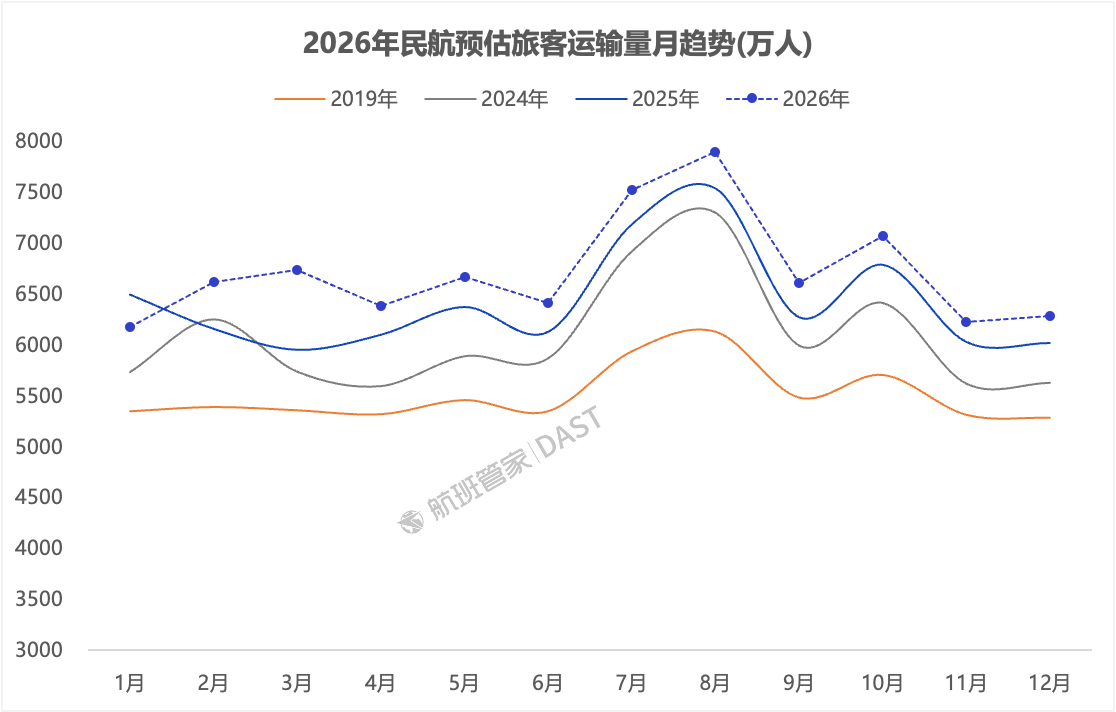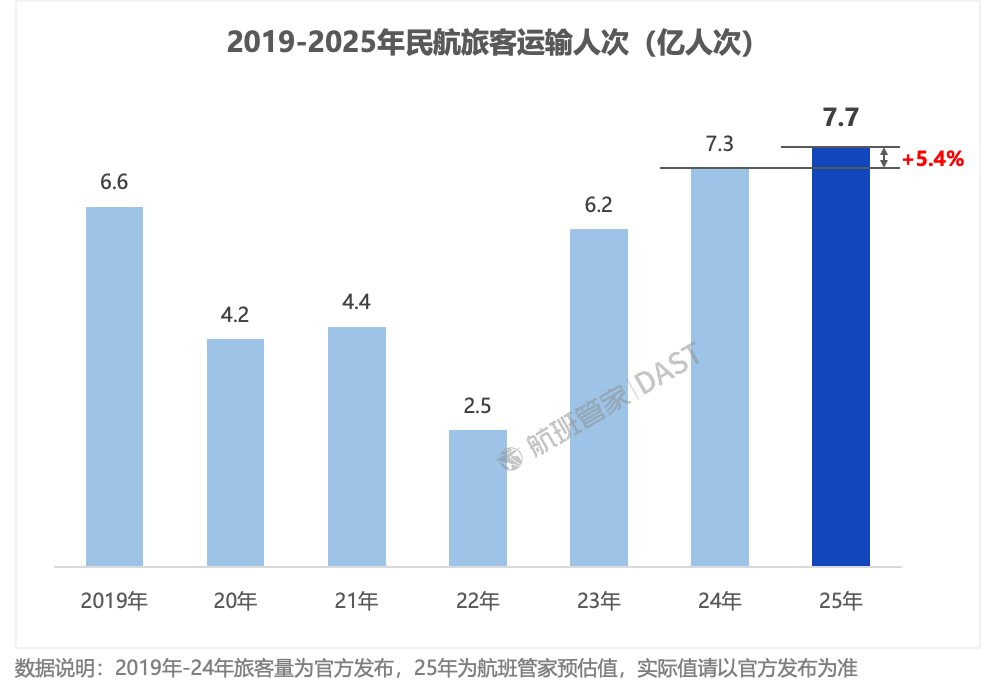 根据航班管家发布的最新预测报告,2025年中国民航市场将迎来全面复苏与结构性调整。全年旅客运输量预计突破7.7亿人次,较2024年增长5.4%,较2019年增长16.6%,创历史新高。其中,国内航线(含地区)旅客量达6.9亿人次,国际航线旅客量达0.8亿人次,国际市场恢复率达87.8%,周航班量稳定在1.2万至1.4万班次之间。
