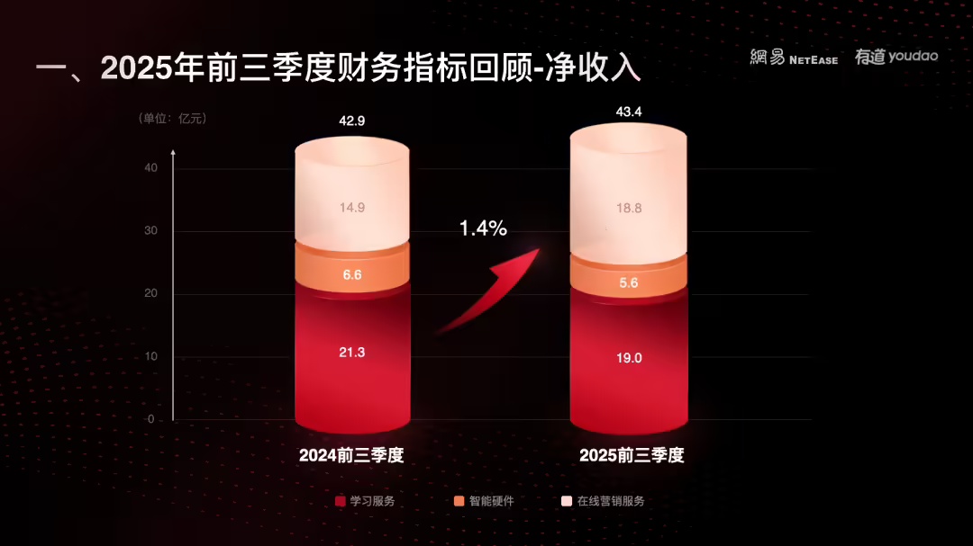 根据网易有道 CEO 周枫披露的财务数据,公司在今年前三季度实现了稳健增长。累计净收入达到 43.4 亿元,同比增长 1.4%。与此同时,运营效率显著提升,销售费用和管理费用等运营成本同比下降,推动经营利润增长至 1.6 亿元,同比增幅高达 149.2%。这一成绩反映出公司在优化成本结构和提升盈利能力方面取得了实质性进展。