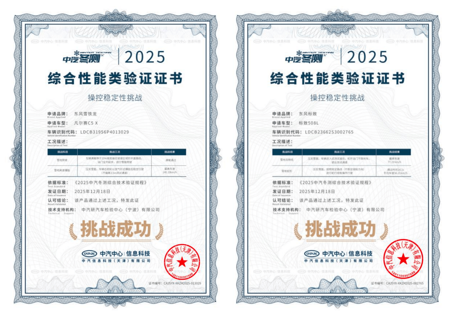 在中国汽车技术研究中心主办的“2025极寒驾控安全主题技术验证”活动中,东风雪铁龙凡尔赛C5 X与东风标致508L凭借出色表现,顺利通过多项严苛测试,展现了法系车在极端环境下的卓越性能与安全实力。