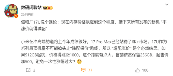 据供应链消息透露,小米17 Ultra在配置方面将延续256GB存储起步的方案,但通过升级影像系统、处理器性能等核心参数实现"增配"。这种策略与小米集团高层此前释放的信号高度吻合——在小米15 Ultra发布会上,总裁卢伟冰曾公开表示:"当前元器件成本持续上涨,虽然15系列维持了原价,但这种状态难以长期持续,下一代产品必然需要调整价格体系。"