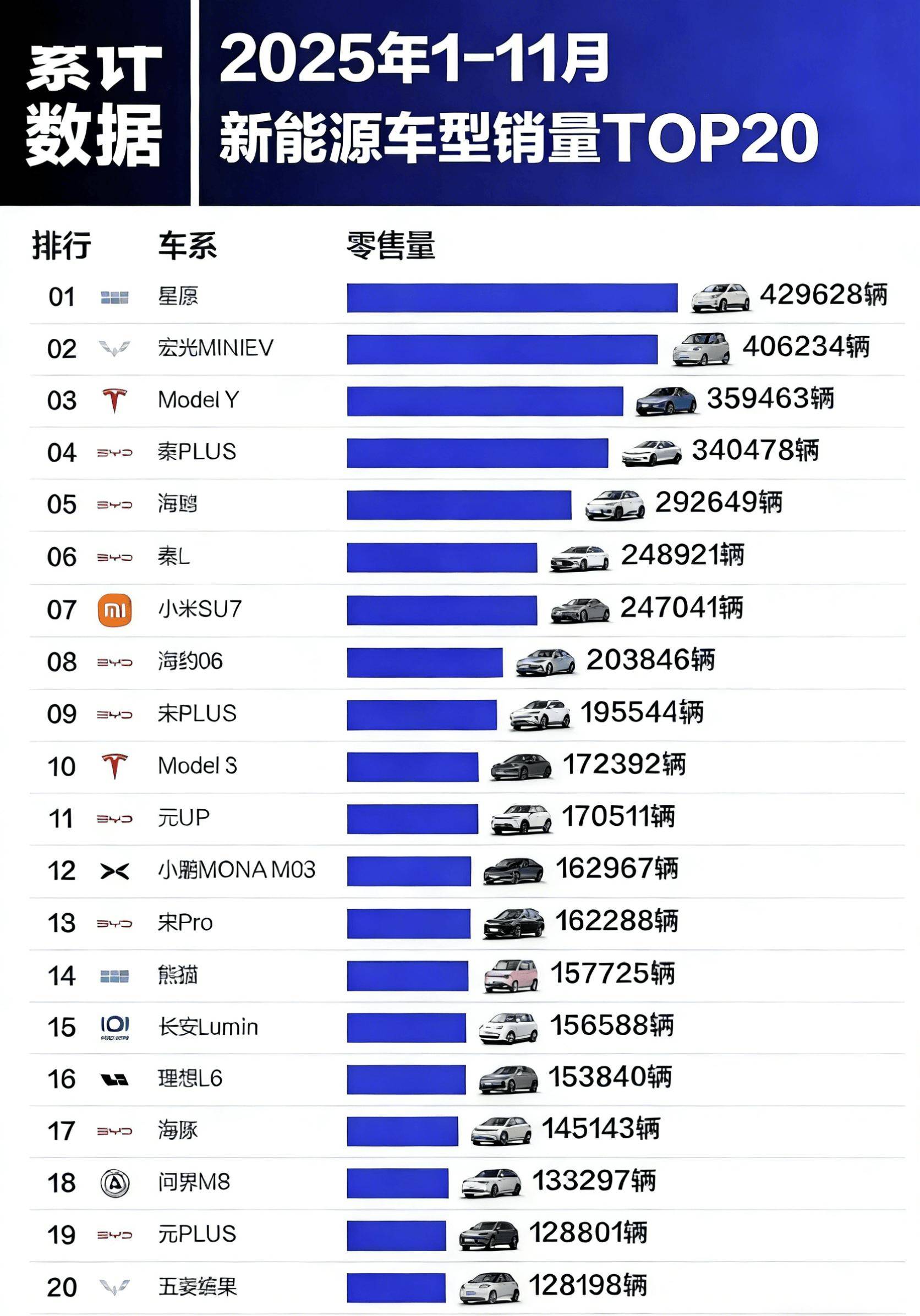 乘联分会最新公布的零售数据显示,2025年1月至11月新能源汽车市场格局已基本明朗,销量前二十榜单中自主品牌占据绝对优势,吉利星愿与特斯拉Model Y分别成为不同细分领域的标杆车型。