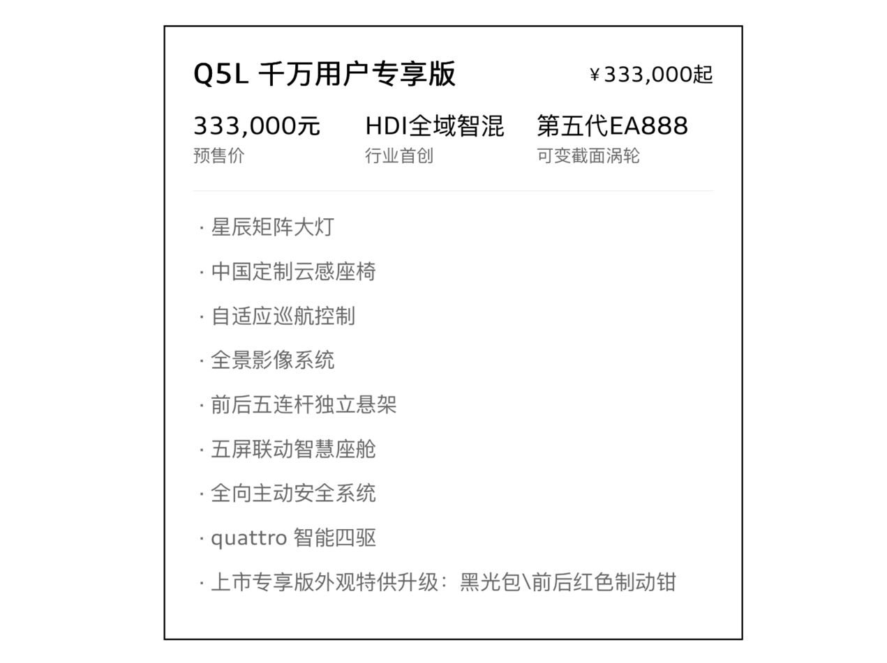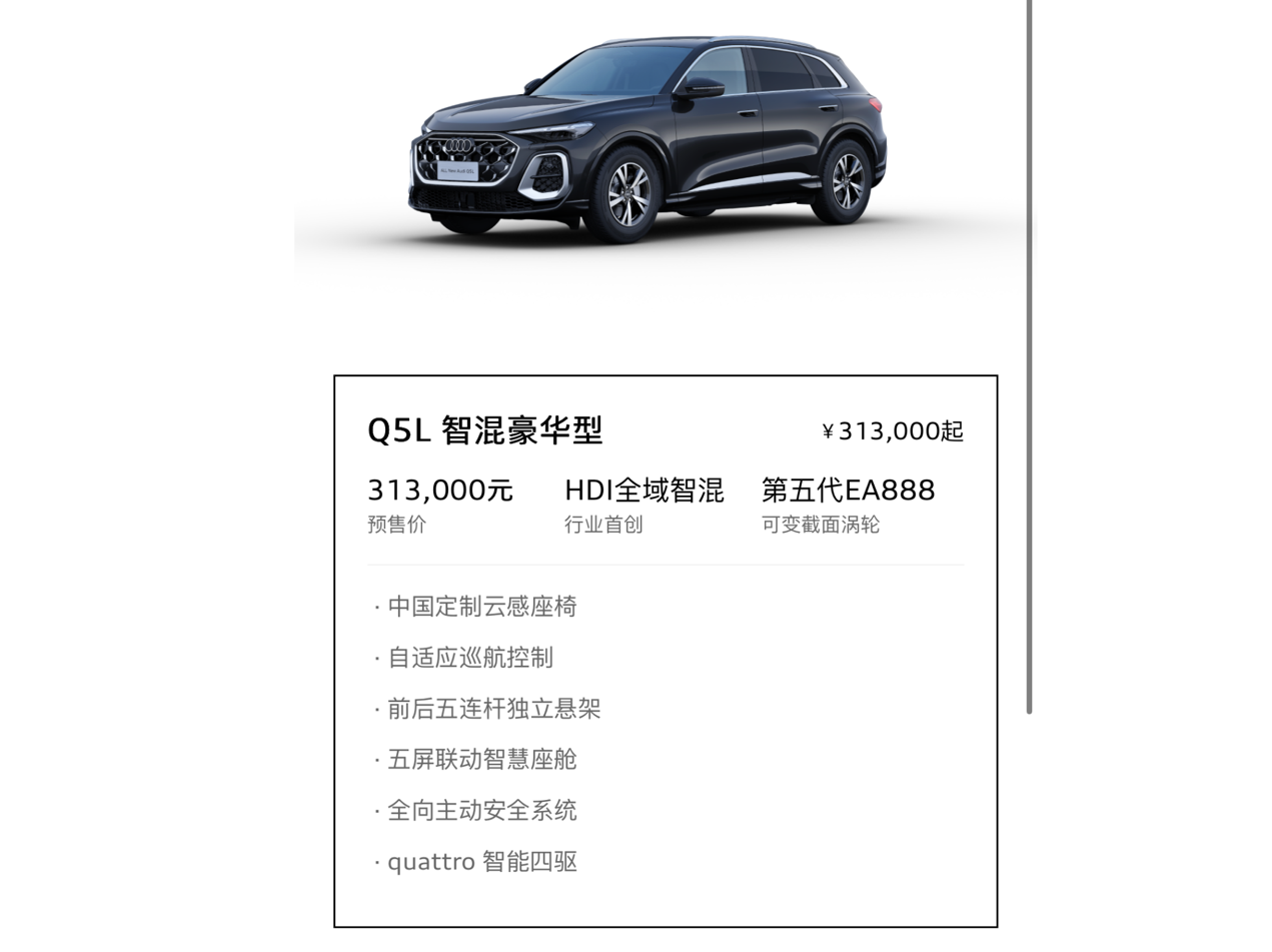 有市场分析指出,参考此前奥迪A5L的定价策略,全新Q5L正式上市时的价格可能进一步下探,预计会留出1.5万元左右的调整空间,实际售价有望进入20万元区间。这一策略或将进一步增强Q5L在豪华中型SUV市场的竞争力,吸引更多消费者的关注。