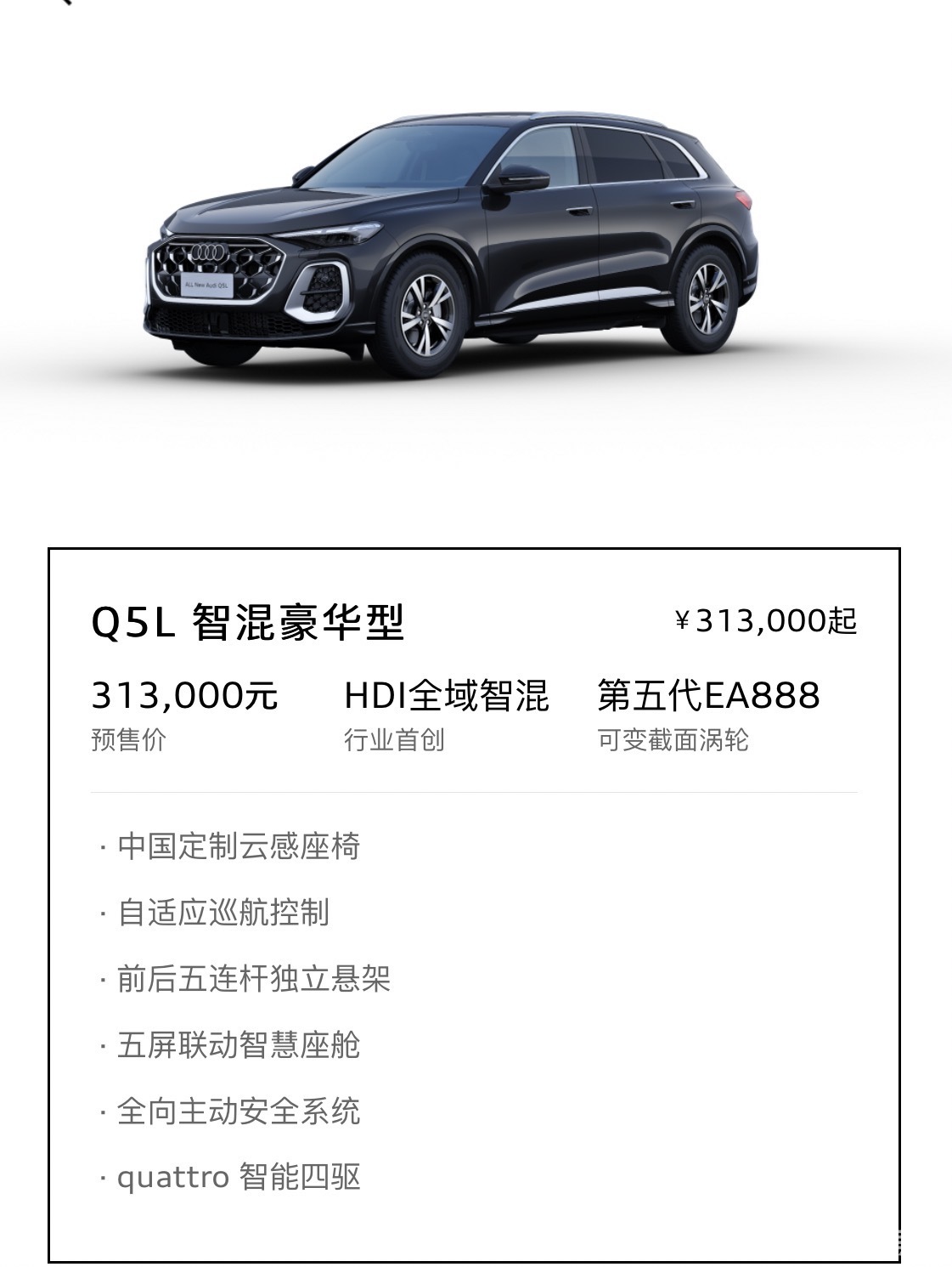 内饰布局上,全新奥迪Q5L同样不乏亮点。其仪表台设计排布与一汽奥迪A5L相近,液晶仪表与中控屏采用双联屏形式,形成悬浮式曲面屏,视觉效果极为震撼。副驾驶娱乐屏也为标配,可实现多屏联动,为乘客带来更加丰富的娱乐体验。在配置方面,全新奥迪Q5L智混豪华型默认配备了倒车影像、实体钥匙等实用功能,而其余车型则标配了360度全景影像、蓝牙数字钥匙以及前排座椅通风/按摩等高端配置。