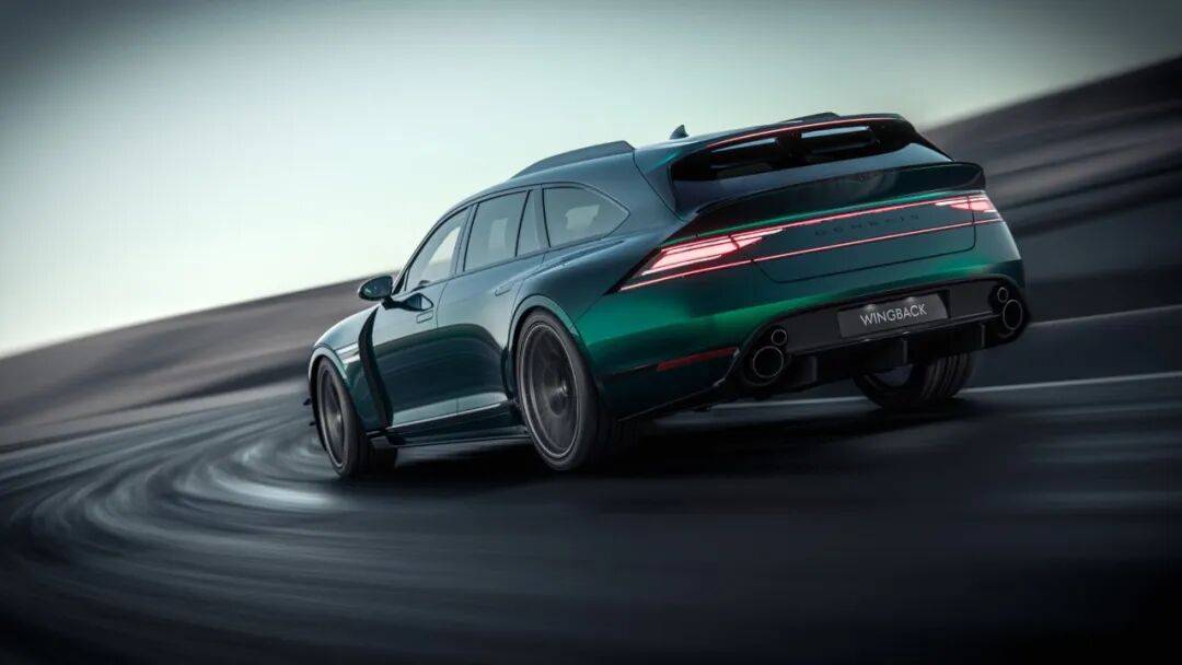 从侧面看,车顶线条经过精心雕琢,延伸出流畅的大型旅行车轮廓,既保留了G90长轴距的优势,又在后端增加了一对扰流翼片,与“Wingback”的命名相呼应。尾部设计同样出彩,倾斜角度明显的后窗由双扰流板勾勒,搭配性能取向的后扩散器和双边四出大小排气管,兼具实用性与美感。