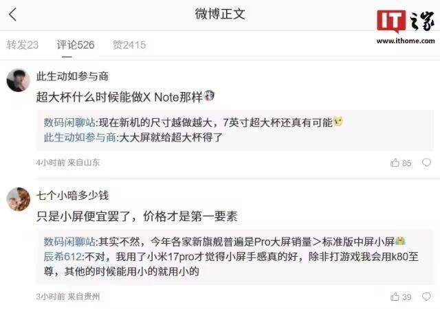 在评论区,博主还回复了网友的一些问题。针对网友关于超大杯手机能否做到像vivo X Note那样大的疑问,博主表示,如今新机尺寸越来越大,7英寸超大杯手机还真有可能出现。对于“只是小屏便宜,价格才是第一要素”的观点,博主回应称,实际情况并非如此,今年各家新旗舰中,Pro大屏版本的销量超过了标准版中屏和小屏版本。