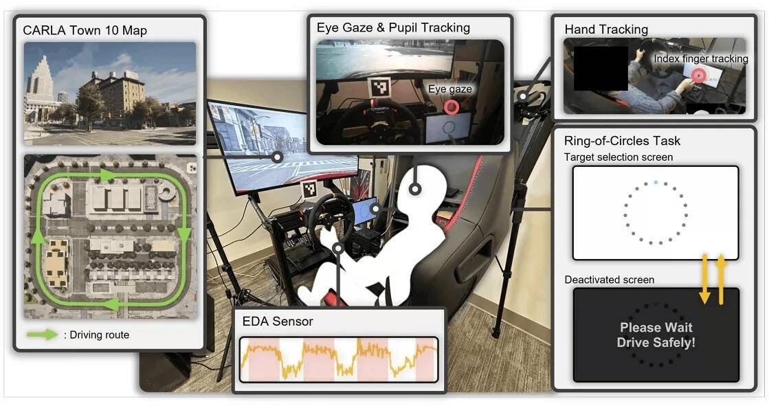 该研究名为《行驶中的触屏:量化认知负荷对分心驾驶的影响》,于2025年9月发表在第38届ACM用户界面软件与技术年度研讨会论文集中。研究人员招募了16名受试者,让他们在高仿真驾驶模拟器中完成测试。测试过程中,研究人员通过追踪眼球运动、手部动作、瞳孔扩张程度和皮肤电导率等指标,综合评估受试者的认知负荷水平。