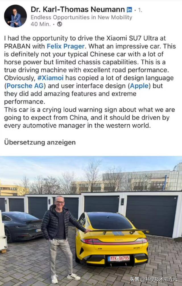 近日,大众中国前首席执行官Dr. Karl-Thomas Neumann在社交平台分享了他试驾小米SU7 Ultra的体验,直言这款车颠覆了他对中国高性能电动车的认知。他特别强调,SU7 Ultra并非传统意义上"配置堆砌但底盘平庸"的车型,而是将道路性能与驾驶乐趣完美融合的"真正驾驶机器"。这一评价迅速引发汽车行业热议,不少业内人士认为,这标志着中国品牌在高端性能车领域实现了质的突破。