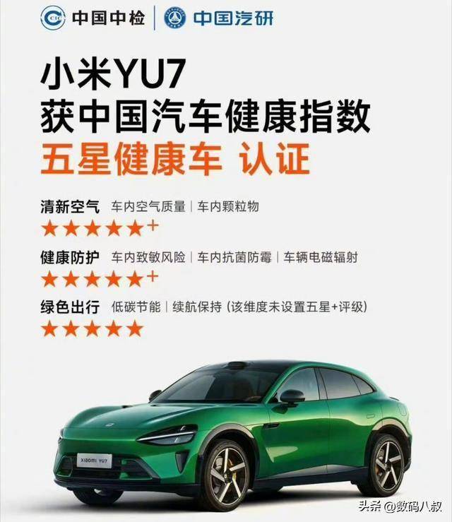 近日,新能源汽车领域迎来一则备受关注的消息:小米YU7荣获中国中检与中国汽研联合颁发的“五星健康车”认证。这一认证不仅在车内空气质量、健康防护两大维度斩获五星+的优异成绩,在绿色出行维度也获评五星,为新能源汽车行业树立了新的标杆。