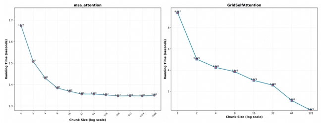 • 整体而言,分块尺寸与计算时间呈负相关关系,因此可在内存容许的情况下,尽量增大分块尺寸;下图展示了 msa_attention 和 GridSelfAttention 在不同分块下的计算时间;