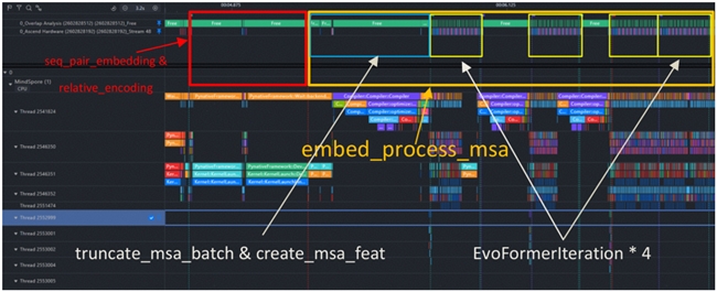 MindSpore 支持用户使用 Profiler 类对模型的性能进行采集,所获得的 Profiling 数据记录了详细的算子时间线,也包括了算子的显存占用信息。Profiling 数据可以通过 MindInsight 工具进行可视化分析,可以查看详细的算子时间线,以及流之间的调用关系。我们可以精确计算出每个模块的位置及其耗时,并据此来确定这些模块是否需要进一步的优化。例如,下图展示了我们对推理过程中 PairFormer 模块的定位与拆解,为后续的时间、内存的分析提供了框架与引导: