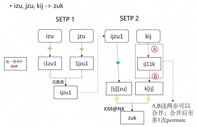 Einsum 高效实现在逻辑上离不开对下标的重排列(permute)。但 permute 操作的时间复杂度是 O(N),我们可以通过优化下标排布,减少或消除显式的 permute 操作,来进一步提升 Einsum 的算子性能。具体操作包括: