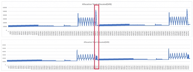 如下图红框处所示,a 为未优化前显存占用曲线,可以看到在红框处达到峰值。通过分析可以确定此处位置用于计算 smooth_lddt_loss,因此将这个部分单独进行重计算后就得到了下图的结果,此处峰值由 55G 下降到 20G 以内。