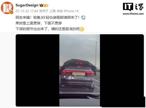 近日,有网友向汽车领域博主@SugarDesign投稿,曝光了极氪8X轻伪装状态下的尾部谍照。从谍照中可以看到,极氪8X的尾灯设计独具特色,采用了上贯穿、下不贯穿的造型。