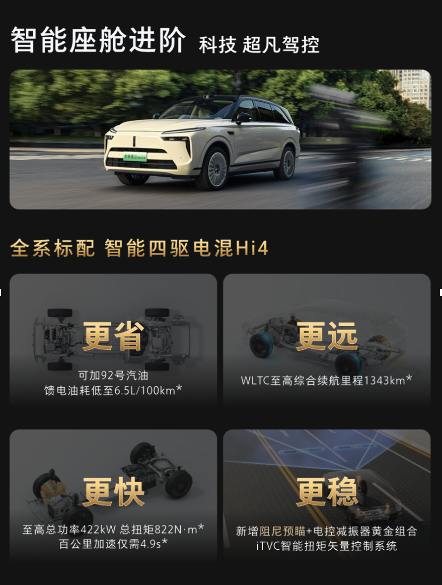 座舱空间设计凸显“全员平等”理念。新车采用2+2+2六座布局,打破传统主副驾与后排的配置差异:全车配备零重力座椅、可调节腿托,第三排空间经过优化后甚至能舒适容纳成年人。7L车载冰箱支持-6℃至50℃宽温域调节,配合23扬声器7.1.4全景声音响与17.3英寸后排娱乐屏,打造出移动的“家庭影院”。智能座舱系统升级至Coffee OS 3.4,新增AI主动服务与晕动舒缓显示功能,进一步降低长途出行的疲劳感。
