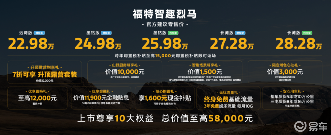 江铃福特近日正式推出全新新能源中型SUV——福特智趣烈马,并同步开启交付。这款基于“福域”原生智能新能源架构打造的车型,共推出五款配置,包括三款增程版与两款纯电版,官方指导价区间为22.98万元至28.28万元。作为福特烈马家族的首款新能源车型,智趣烈马以“可城、可玩、可野”为核心卖点,瞄准追求多元生活方式的消费群体,试图在竞争激烈的市场中开辟新赛道。