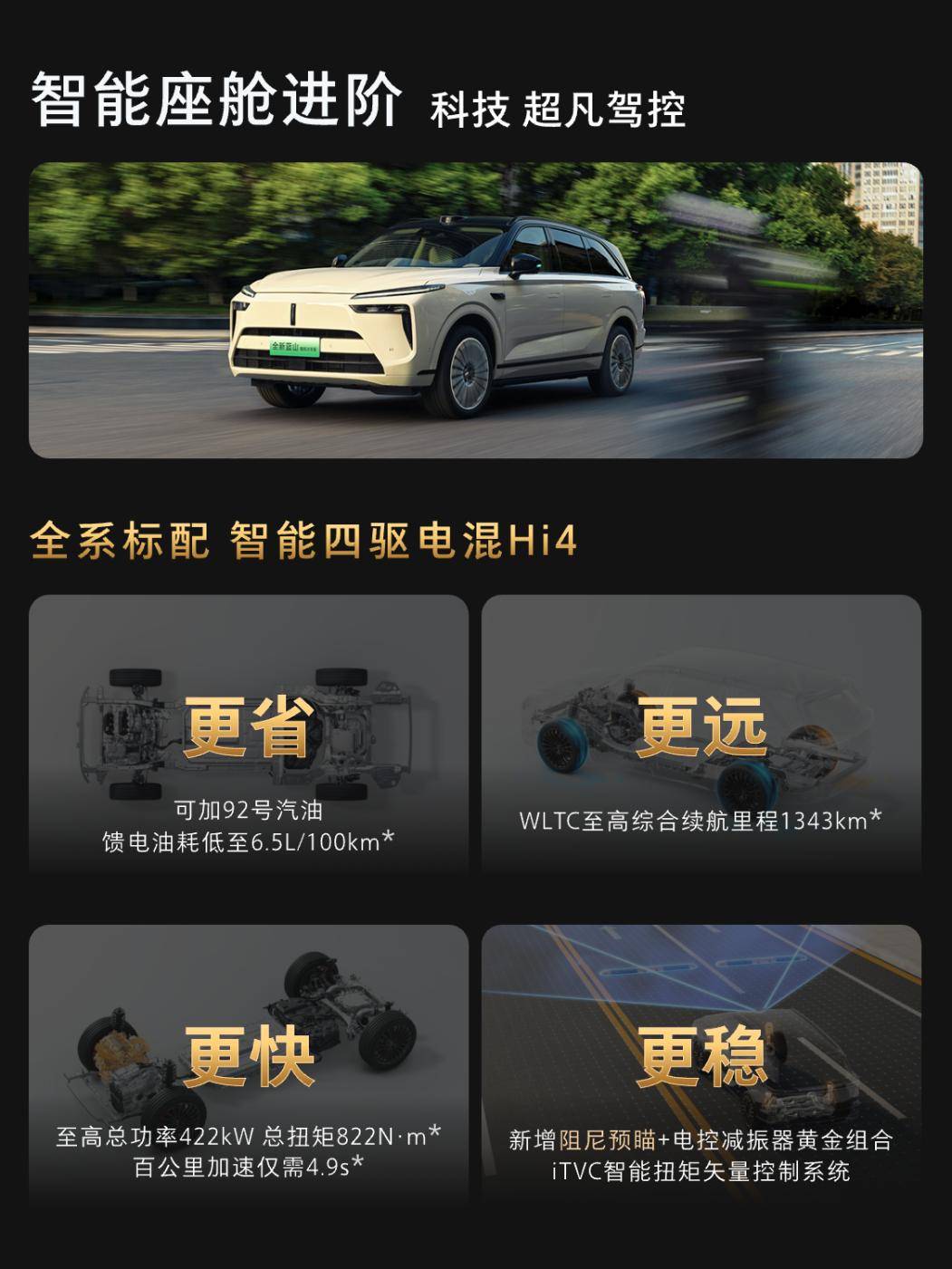 在动力系统方面,全新蓝山智能进阶版搭载了Hi4性能版智能四驱电混技术。这一技术借鉴了“都江堰”的智慧,通过智能调度实现全场景的省、远、快、稳。Hi4性能版是全球首创的四挡全速域直驱技术,零百加速仅需4.9秒,馈电油耗低至6.5L/100km,综合续航可达1343km。前后50:50的轴荷分配和iTVC智能扭矩控制,为全家出行提供了从容安稳的驾乘体验。