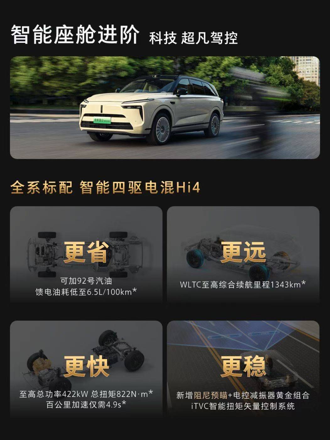 动力系统方面,全新蓝山智能进阶版全系标配Hi4性能版智能四驱电混技术。该系统由1.5T涡轮增压发动机与前后双电机组成,系统综合功率达392千瓦,零百加速仅需4.9秒,性能表现媲美纯电车型。续航能力上,车辆提供两种电池容量选择,WLTC工况下纯电续航分别为185公里与220公里,综合续航最高可达1343公里,有效缓解用户的里程焦虑。这一数据在同级插混SUV中处于领先水平,尤其适合长途出行场景。