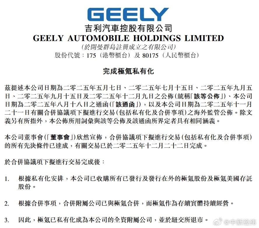 吉利汽车近日在港交所发布重要公告,宣布其此前披露的合并协议项下交易已顺利完成。根据公告内容,此次交易涉及私有化及合并事项,所有预设的先决条件均已达成,并于2025年12月22日正式落地实施。