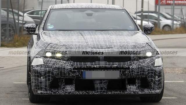 从车头设计来看,新款M5展现出强烈的攻击性。其配备了前置摄像头,双肾格栅与牌照板之间设有一条水平的细缝开口,为车头增添了独特的视觉效果。前保险杠的设计尤为激进,四个深邃的进气口不仅提升了车辆的散热性能,更进一步强化了车头的战斗气息。