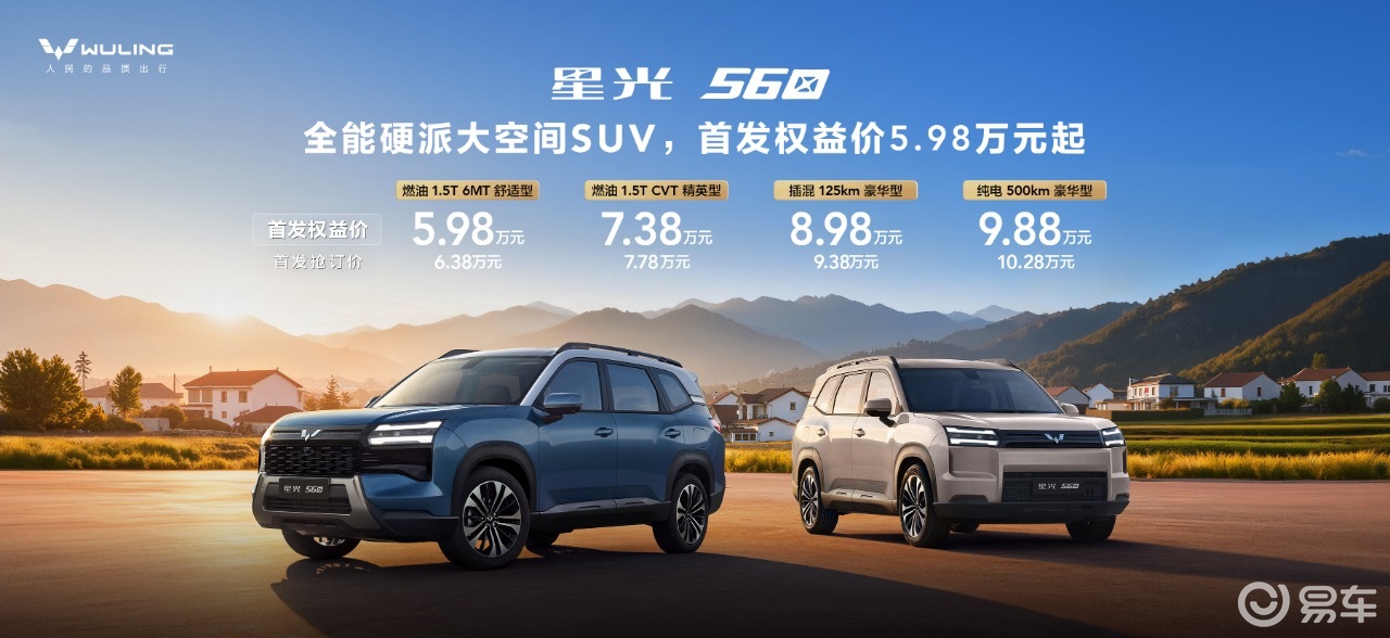 五菱品牌即将推出一款全新紧凑型SUV——五菱星光560,目前该车型已完成亮相并开启预订,预计于2026年1月正式上市,具体日期尚未公布。此次共推出4款车型,涵盖燃油、插混、纯电三种动力形式,原首发抢订价区间为6.38万-10.28万元,首发权益价则为5.98万-9.88万元。