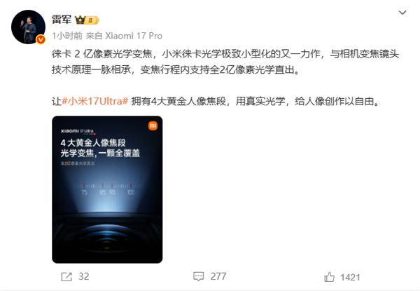 雷军在社交平台发布动态,详细介绍了小米即将推出的影像旗舰机型——小米17 Ultra的核心光学技术突破。这款新机搭载的徕卡2亿像素光学变焦系统,实现了相机级变焦技术的移动端小型化应用,在变焦全程均支持原生2亿像素输出,彻底告别传统数码裁切带来的画质损耗。