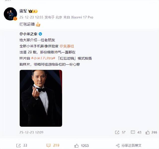 知名艺人吴彦祖近日正式担任小米手机全新影像体验官,这一消息由小米之家官方微博率先发布。此次合作中,吴彦祖通过小米最新旗舰机型小米17Ultra的"红毯运镜"模式拍摄了多组样片,展现了该机型在动态影像捕捉方面的独特优势。