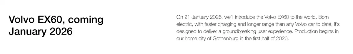 沃尔沃品牌即将在纯电SUV领域再添新成员——沃尔沃EX60。这款基于SPA3纯电平台打造的全新车型,预计将于2026年1月21日正式亮相,其WLTP工况下的纯电续航里程有望突破700公里,成为品牌在新能源市场的重要布局。