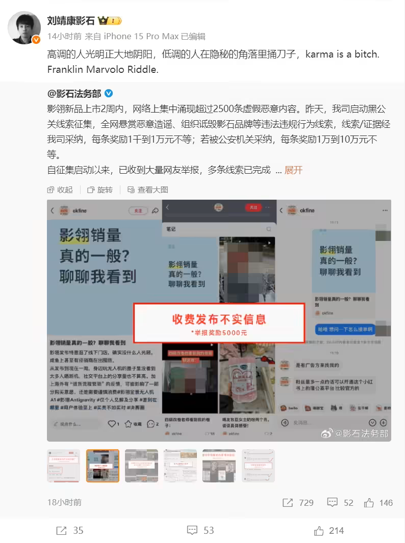 12月23日,影石首席执行官刘靖康转发该声明并发表评论,引用英文俚语“karma is a bitch”暗指因果报应,同时提及小说《哈利波特》中反派伏地魔的原名“Marvolo Riddle”,并特别标注“Franklin”一词。据公开信息显示,大疆创新首席执行官汪滔的英文名正是Frank,这一细节引发外界对行业竞争态势的联想。