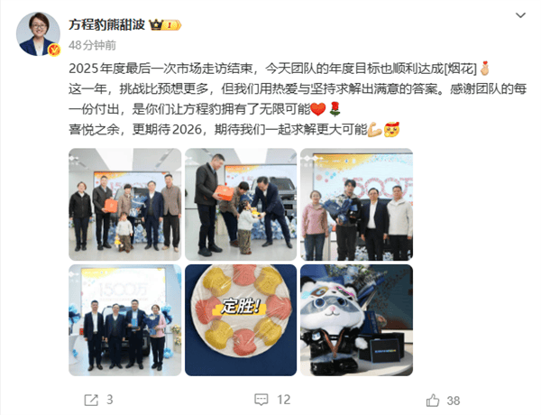 比亚迪旗下硬派越野品牌方程豹近日宣布,已成功完成2025年度既定销量目标。品牌总经理熊甜波在社交平台发文称:“完成年度最后一次市场调研后,团队顺利达成全年目标。尽管面临诸多挑战,但凭借对产品的热爱与执着,我们交出了一份令人满意的答卷。”不过,她并未透露具体销量数字。