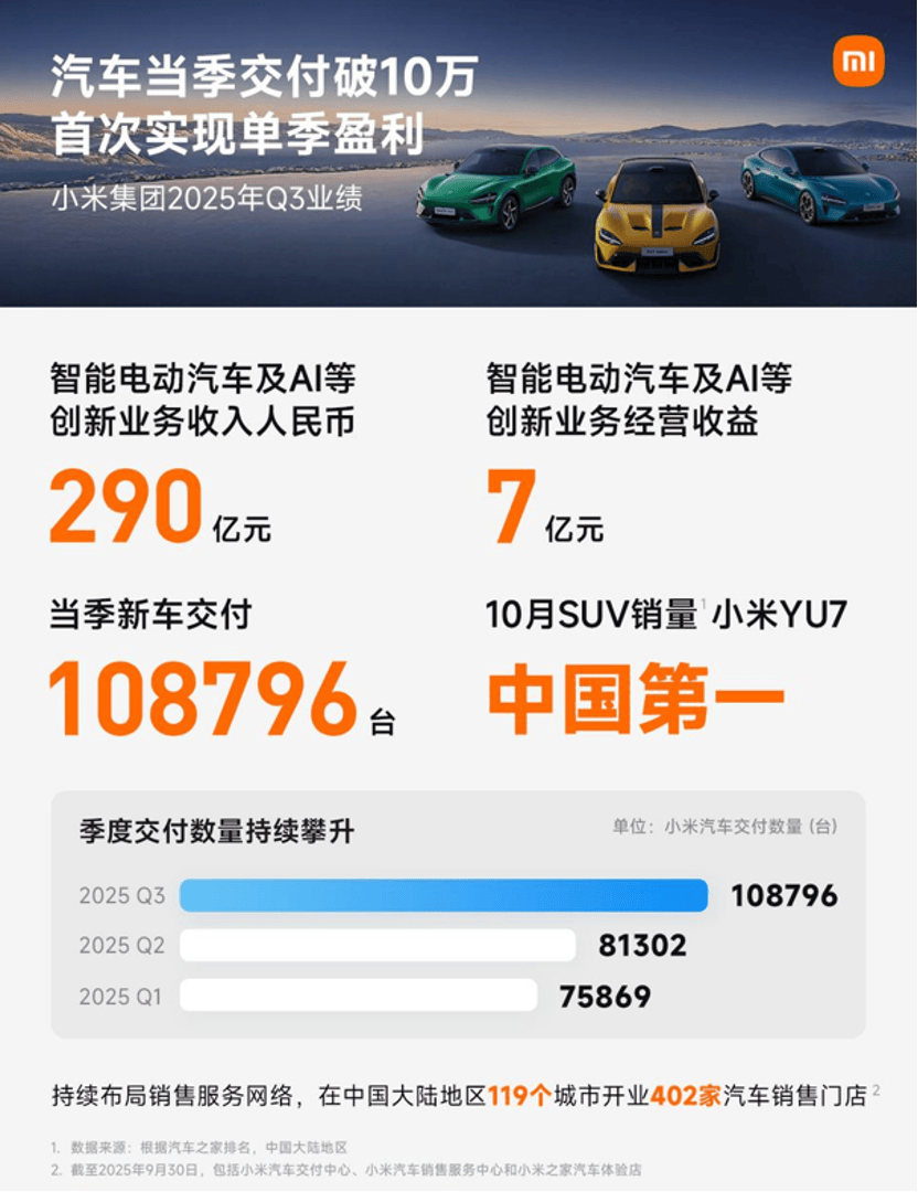 2025年第三季度财报显示,小米汽车业务以290亿元营收、199.2%的同比增速引发行业震动,更以6个季度实现盈利的效率刷新中国新能源车企纪录。全年36万辆交付量与25.5%的毛利率,配合26.2万元的单车均价,彻底打破了传统汽车产业“价格-销量-利润”的三角悖论。这场由互联网思维驱动的造车运动,正以颠覆性姿态重塑行业规则。