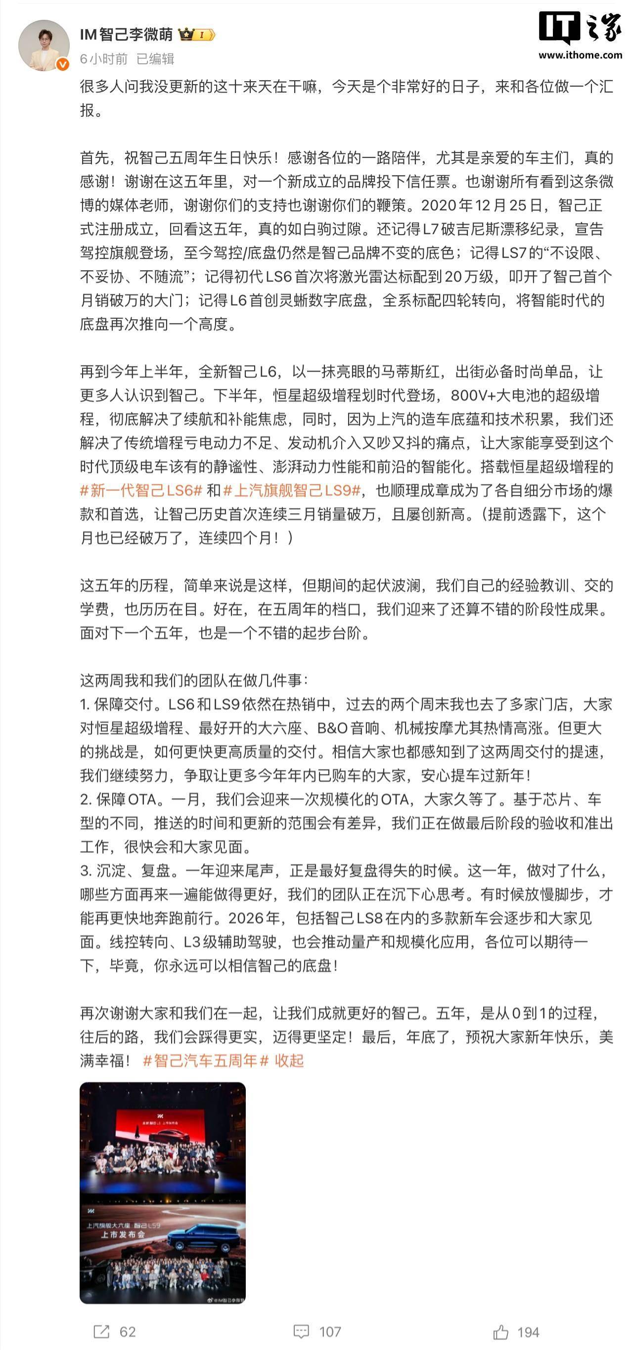 针对当前用户关切,李微萌同步披露了交付与服务进展。品牌正全力保障智己LS6与LS9的年底交付工作,确保年内订车用户能在春节前提车。同时宣布将于2025年1月启动大规模OTA升级,具体推送时间与更新内容将根据车型及芯片配置差异化部署。此次升级预计将优化智能座舱交互体验与辅助驾驶功能,强化产品竞争力。