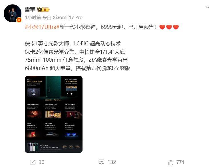 目前,小米17 Ultra已开启预售,消费者可以通过官方渠道进行购买。这款手机的发布,不仅展现了小米在高端市场的持续发力,也为用户提供了更多选择。