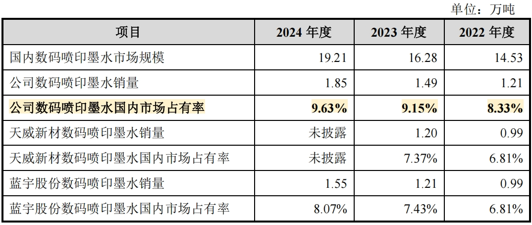 墨库股份的核心业务涵盖数码喷印墨水的研发、生产及销售,产品线包括分散墨水、涂料墨水、UV墨水和水性染料墨水等。财务数据显示,2024年公司实现营业收入7.27亿元,扣非后归母净利润达1.42亿元。过去三年间,其营收从2022年的5.22亿元增长至2024年的7.27亿元,年均复合增长率为17.95%;同期扣非后归母净利润从0.81亿元提升至1.42亿元,年均复合增长率达32.27%,展现出强劲的增长势头。