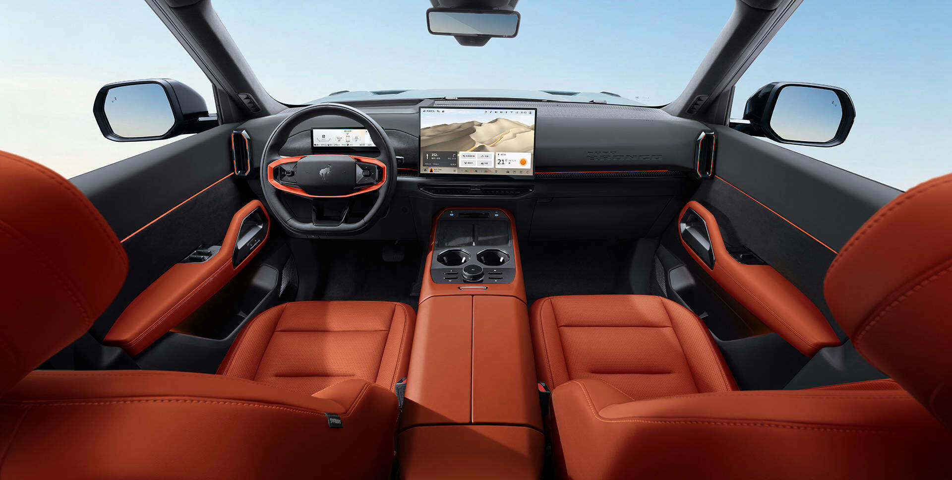 在尺寸与空间表现上,两款车均定位于中大型SUV,提供了宽敞的车内乘坐环境。福特智趣烈马车身长宽高分别为5025mm、1960mm和1825mm,轴距达到2950mm,略胜一筹。该车采用5座布局,常规状态下后备厢容积高达497L,纯电版车型还额外配备了一个容量达160L的前备厢。座椅支持一键放平功能,可轻松形成一张长达2米的“大床”,满足日常通勤和户外旅行的需求。新车还具备30°接近角和32°离去角,空载最小离地间隙为220mm,最大涉水深度可达600mm,兼顾了城市驾驶的便捷性和越野通过能力。方程豹钛7的车身尺寸长宽高分别为4999毫米、1995毫米和1865毫米,轴距达到了2920毫米。车内乘员舱的有效车长为3310毫米,得房率高达70.9%,头部空间表现十分出色。后备厢在常规状态下的容积可达970升,当二排座椅放倒后,最大容积更是能够扩展至1880升,储物空间表现卓越。然而,与智趣烈马相比,钛7的城市属性更为明显,其接近角和离去角分别为24°和25°,但官方并未公布最小离地间隙以及涉水深度的具体数据。