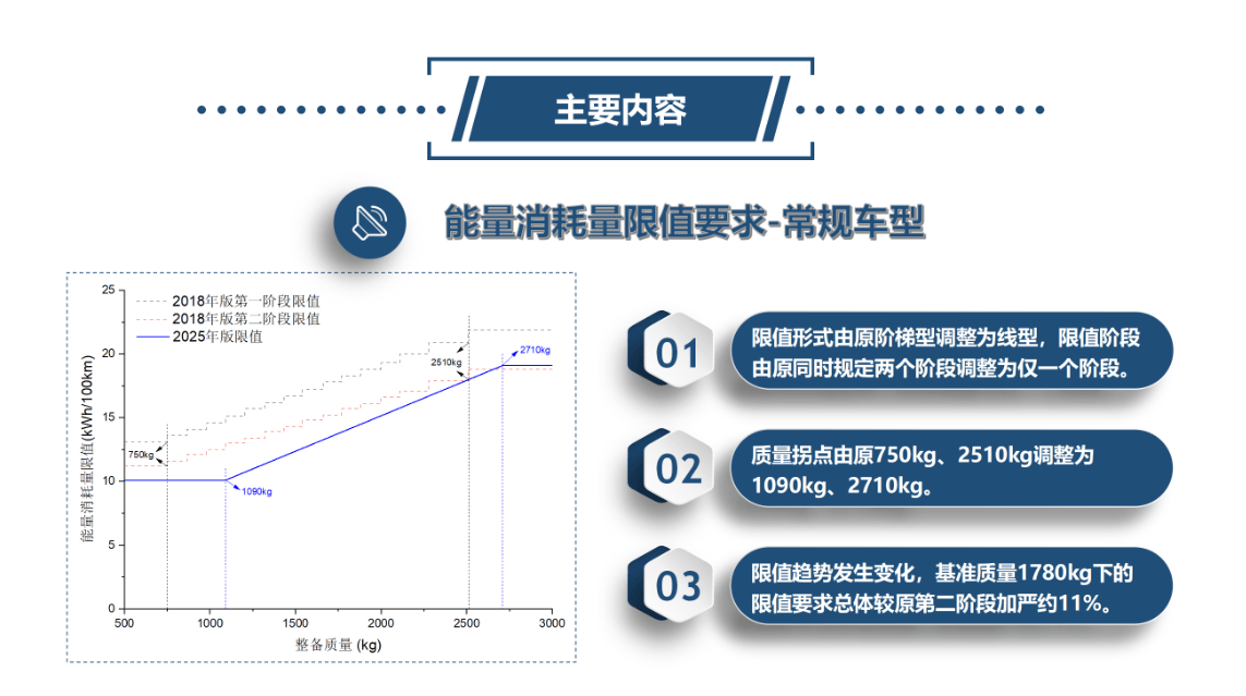 相较于2021年实施的推荐性标准,此次升级后的规范显著提高了技术门槛。以基准质量1780公斤的车型为例,电耗限值整体收紧约11%,同时针对不同质量段实施差异化管控。新标准将质量分级体系从原有的双拐点阶梯模型(750kg、2510kg)优化为三拐点线性模型(1090kg、2710kg),使管控精度提升30%以上。这种调整既考虑了小型车的轻量化需求,也兼顾了大型车的动力特性,形成更科学的评价体系。