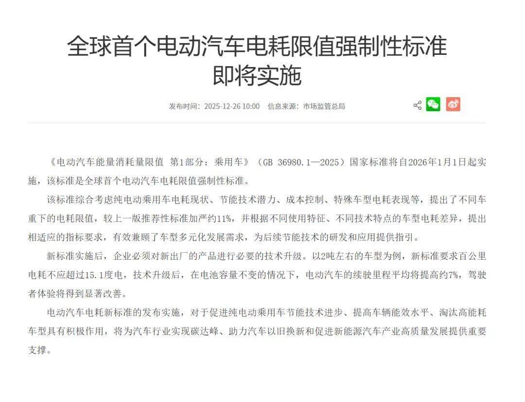 市场监管总局近日正式发布《电动汽车能量消耗量限制第1部分:乘用车》强制性标准,该标准将于2026年1月1日起全面实施。作为全球首个针对电动汽车电耗的强制性规范,新标准在综合考量纯电动乘用车现有电耗水平、技术升级潜力、成本控制需求以及特殊车型性能表现的基础上,制定了基于不同整车质量的电耗限值体系。与现行推荐性标准相比,新规的限值要求严格了约11%,并针对不同使用场景和技术路线的车型设置了差异化指标。