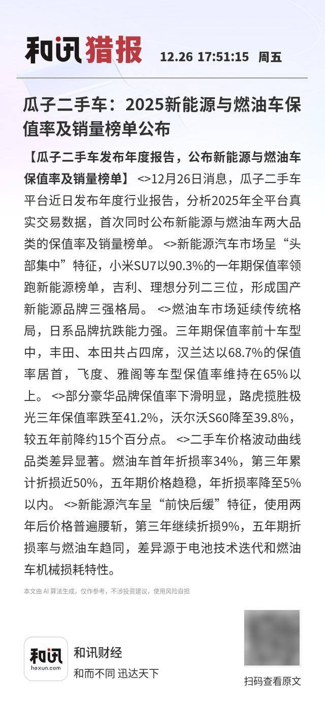 瓜子二手车平台最新发布的年度行业报告显示,2025年二手车市场呈现新能源与燃油车分化的显著特征。报告首次将新能源车型与燃油车型的保值率及销量数据同步公开,揭示出两大品类的市场表现差异。数据显示,新能源汽车市场呈现明显的头部效应,小米SU7以90.3%的一年期保值率领跑新能源榜单,吉利银河系列和理想L系列分列第二、三位,国产新能源品牌形成三强格局。