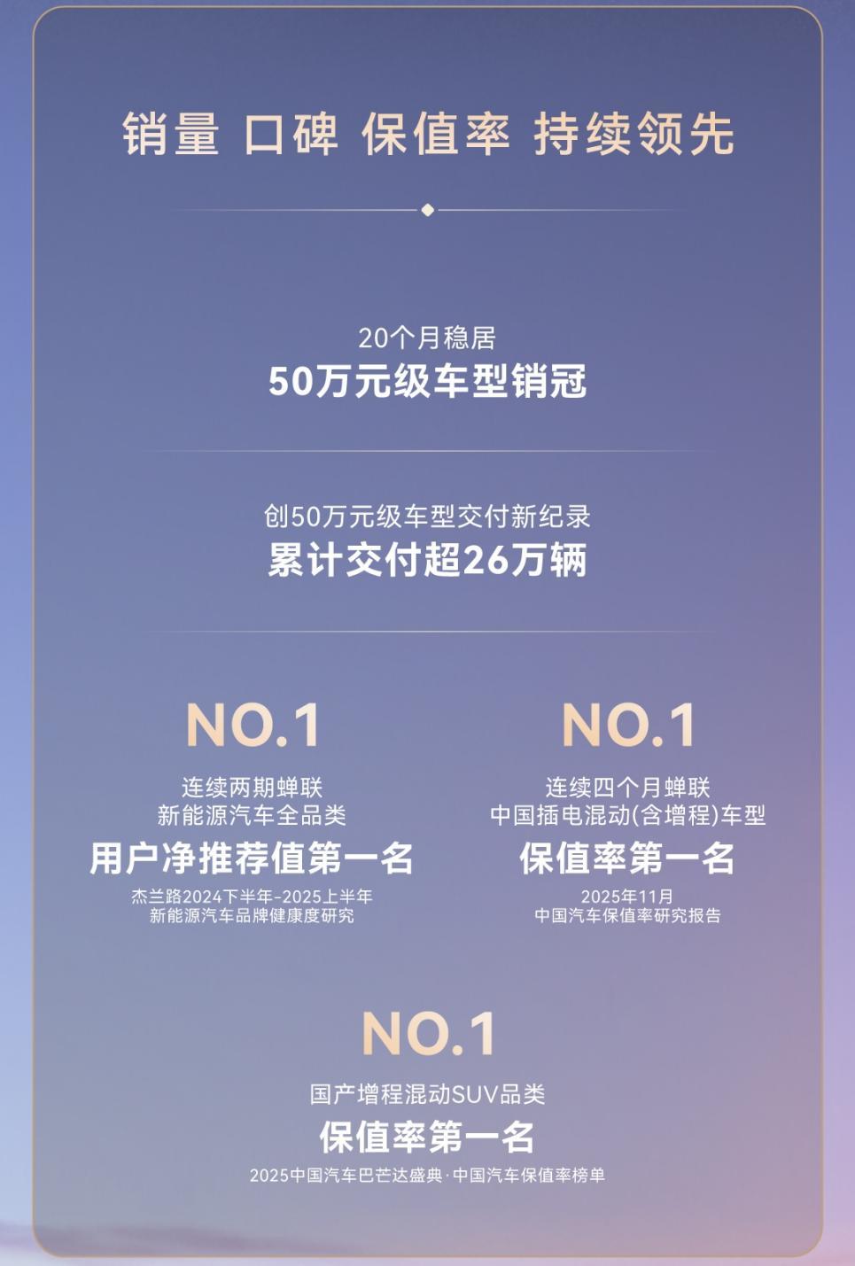 在50万元以上中国品牌新能源SUV市场,问界M9凭借“科技豪华”的定位,成为销量与口碑双丰收的标杆车型。官方数据显示,截至上市两周年节点,其累计交付量已突破26万辆,不仅在保值率、用户净推荐值(NPS)等核心指标上持续领跑,更通过智能化与持续迭代的产品力,构建起难以复制的市场壁垒。