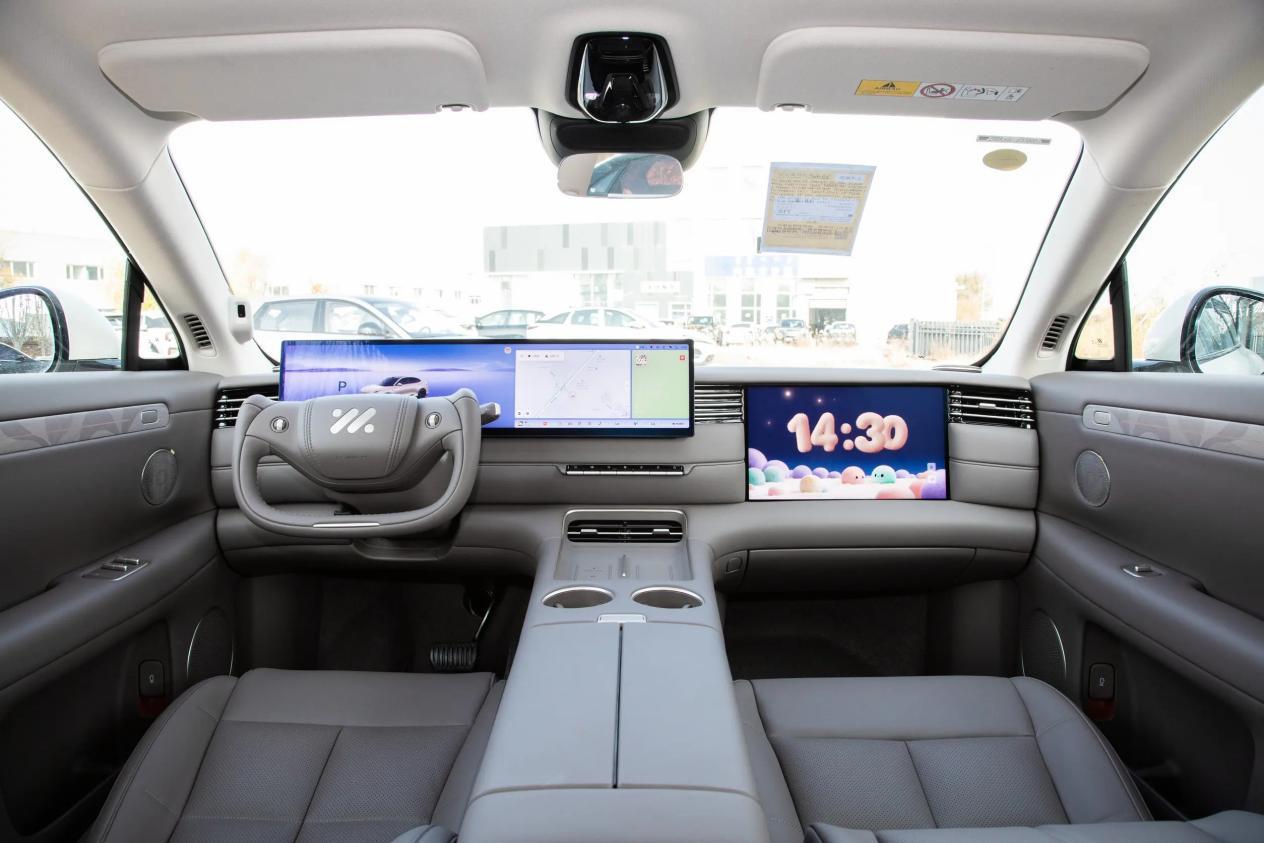 智己LS6的内饰同样走简约科技路线,半辐式真皮方向盘和电子式怀挡设计使其操作起来更加方便。中控台左侧的27.1英寸一体屏融合了仪表盘和中控屏功能,内置高通骁龙8295芯片和IM AIOS操作系统,支持5G网络、应用下载和语音识别等功能,但暂不支持可见即可说。智己LS6还配备了车载冰箱、256色主动式环境氛围灯、主动降噪系统和50W手机无线充电面板等配置,进一步提升了车内的舒适性和便利性。