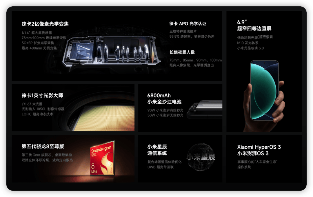 核心配置保持旗舰水准,第五代骁龙8至尊版处理器搭配双路立体冷泵系统,确保性能持续稳定输出。6800mAh金沙江电池配合90W有线+50W无线快充组合,有效缓解续航焦虑。6.9英寸M10发光材质屏幕实现3500尼特峰值亮度,龙晶玻璃3.0使抗跌落性能提升20倍。生态互联方面实现重大突破,首次支持iPhone对小米设备的完整投屏操控,苹果生态用户可无缝接入妙享桌面系统。
