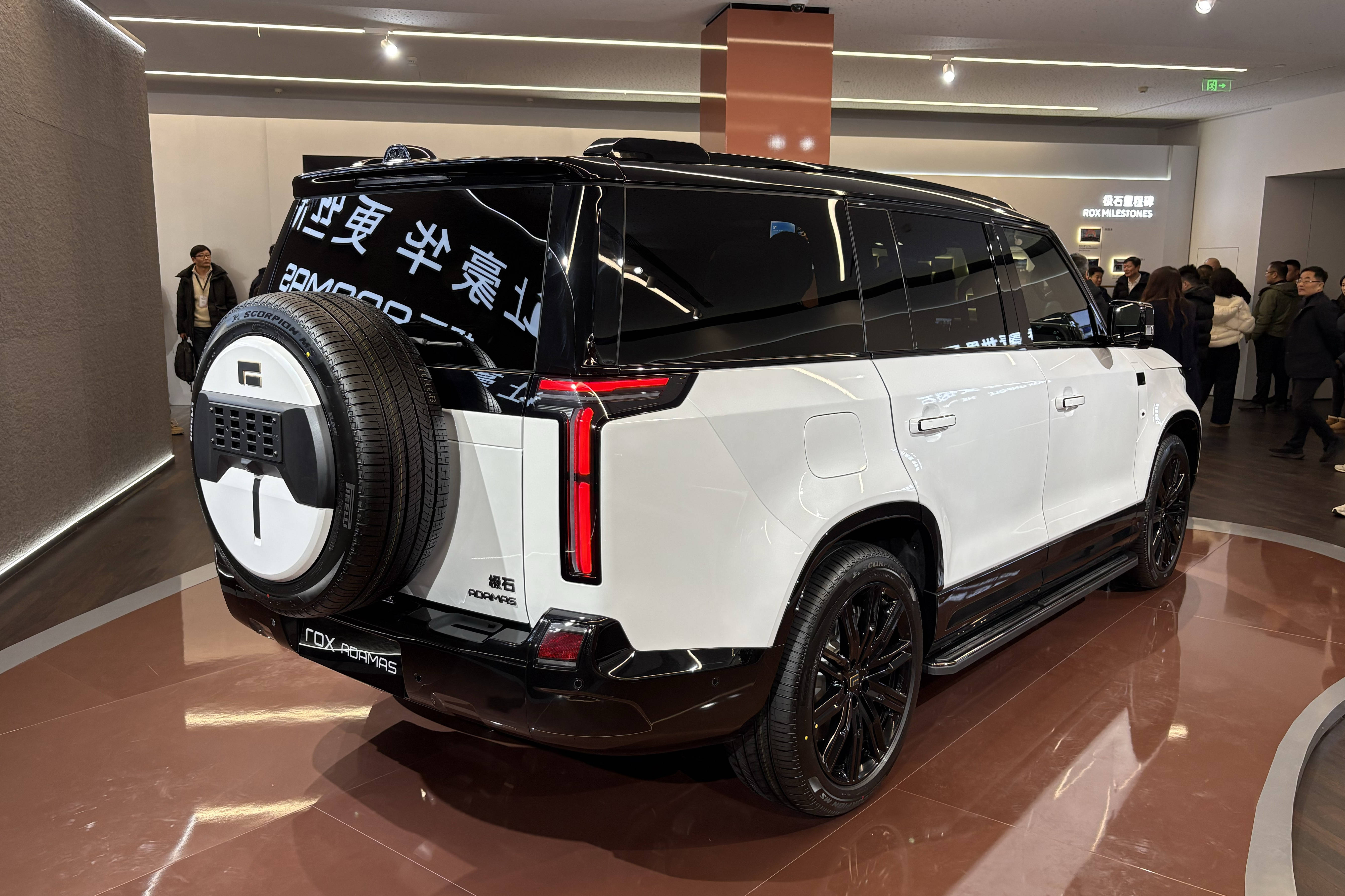 底盘技术升级成为新车核心亮点之一。极石ADAMAS采用全铝材质轻量化底盘设计,搭配全新闭式空气悬架系统,悬架调节行程达140mm,可适应多种复杂路况。车辆最大涉水深度提升至770mm,配合七种智能全地形模式(包括沙地、泥地、雪地等),进一步强化越野通过性。承载式车身结构在保证强度的同时优化了车内空间布局。