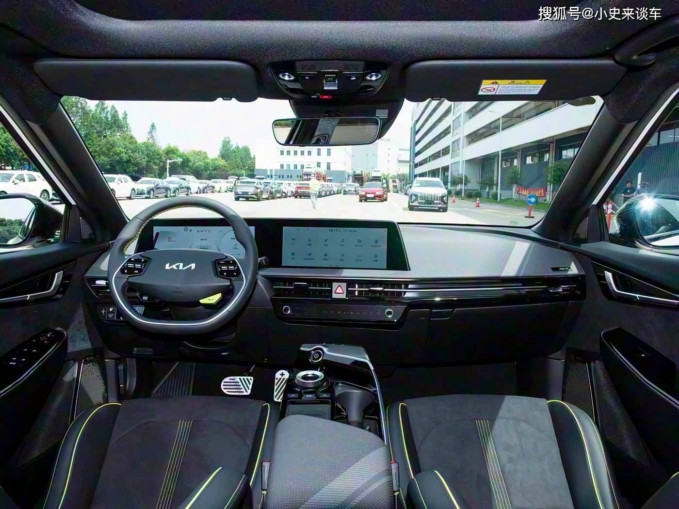 车身侧面是EV6 GT设计语言的集中展现。悬浮式车顶与隐藏式门把手的组合,搭配双色运动轮毂,勾勒出简洁而富有张力的视觉效果。2900mm轴距与4695mm车长构建的“四轮四角”布局,配合短前后悬设计,既提升了操控灵活性,又营造出蓄势待发的俯冲姿态。侧裙黑色装饰板与贯穿式尾灯形成视觉延伸,配合两厢半跨界造型,使其在Model Y等同级竞品中形成差异化优势。车尾设计延续简洁风格,贯穿式点阵尾灯组夜间辨识度极高,小鸭尾与扩散器组合强化运动属性,白底转向灯的复古元素则为整体设计增添细节巧思。