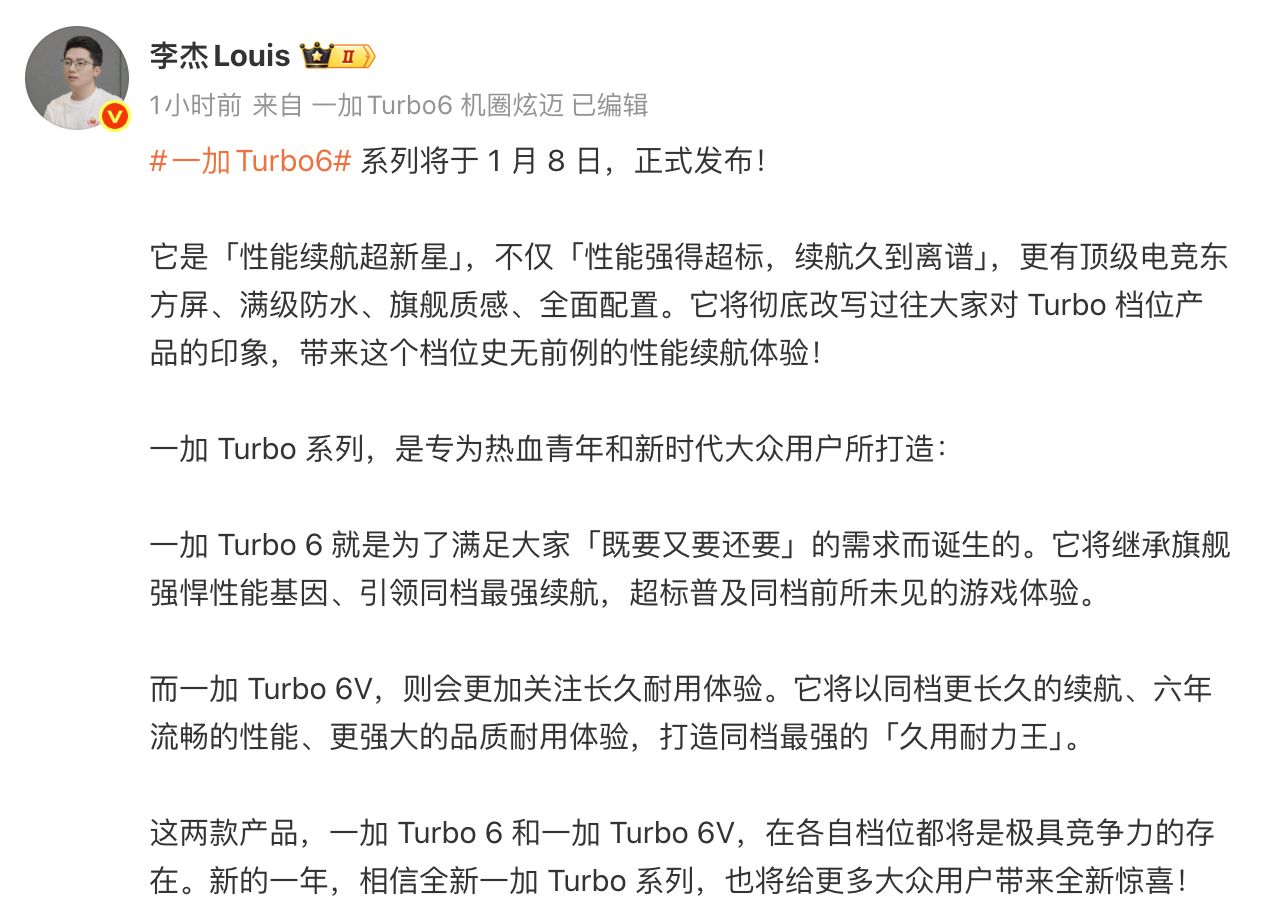 一加官方近日正式对外宣布,将于2026年1月8日推出全新产品——一加 Turbo 6系列。该系列以“性能续航超新星”为定位,旨在将旗舰级的性能表现与持久续航体验带给更广泛的年轻用户群体,重新定义中端市场的产品标准。
