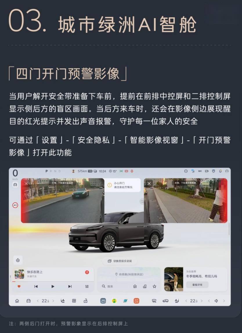 安全功能升级聚焦开门预警场景,城市绿洲AI智舱系统在用户解开安全带时,自动在中控屏与后排屏幕显示侧后方盲区影像。若检测到后方来车,影像侧边将闪烁红光并发出警报,用户可通过设置菜单开启此功能。蓝牙钥匙新增距离调节选项,支持近、中、远三档解闭锁范围设置,适应不同使用场景。