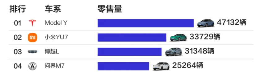 在2025年11月的SUV销量榜单中,特斯拉Model Y、小米YU7与问界M7分列前三甲(除第三名外),25万至35万级市场呈现“三强争霸”格局。这三款车型凭借差异化定位与技术路线,成为消费者关注的焦点。对于预算30万元左右的购车群体,如何从这三款车中做出选择?本文将从设计、性能、智能化等维度展开深度对比。