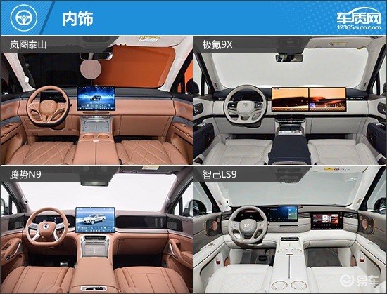 内饰布局与配置差异进一步凸显品牌调性。岚图泰山与腾势N9延续沉稳规整的座舱设计,极氪9X通过中控与副驾娱乐屏的一体式联屏强化视觉延伸感,智己LS9则以仪表盘与中控屏连体、副驾娱乐屏独立的三屏组合塑造科技交互中心。配置层面,岚图泰山、极氪9X与腾势N9均标配AR-HUD增强现实抬头显示、第三排座椅前后调节及车内PM2.5过滤装置,其中岚图泰山独享第三排座椅通风,极氪9X配备真皮方向盘,腾势N9提供后排手机无线充电与第三排座椅高低调节;智己LS9虽配置稍显基础,但增程式动力与纯电续航优势仍具竞争力。